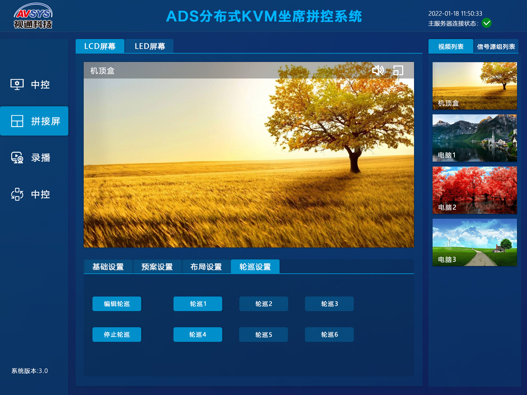 AS-IMC V3.0可视化综合管理平台是便于控制管理音视频综合一体主机、分布式KVM坐席拼控系统、行业录播主机等产品的一款应用软件,软件采用可编程设计构架,提供场景预案管理、音视视信号统一管理,设备列表及在线管理,视频切换管理、大屏拼控管理、录播管理、视频交互管理、音频管理、环境中控管理、设备系统状态管理、系统配置及账号权限管理、跨平台及有线无线管理等功能于一体。